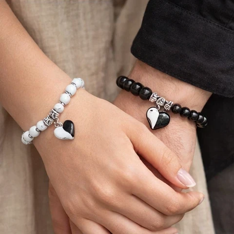 Product DescriptionCelebrate your bond with the Magnetic Couple Bracelet – Stay Connected Always, a meaningful and stylish accessory designed for couples. This elegant set features premium black matte beads and white natural stone beads, perfectly paired to symbolize balance and unity. The highlight is the magnetic heart charm, which connects when both bracelets come close—representing love, attraction, and togetherness. Crafted with a high-quality elastic cord, these bracelets are comfortable, durable, and easy to wear all day. Whether it’s for daily use or special occasions, this bracelet set makes a perfect romantic gift for couples. Key Features❤️ Magnetic Heart Charm – Symbol of love & connection Product SpecificationsProduct Type: Couple Bracelet Set Package Includes