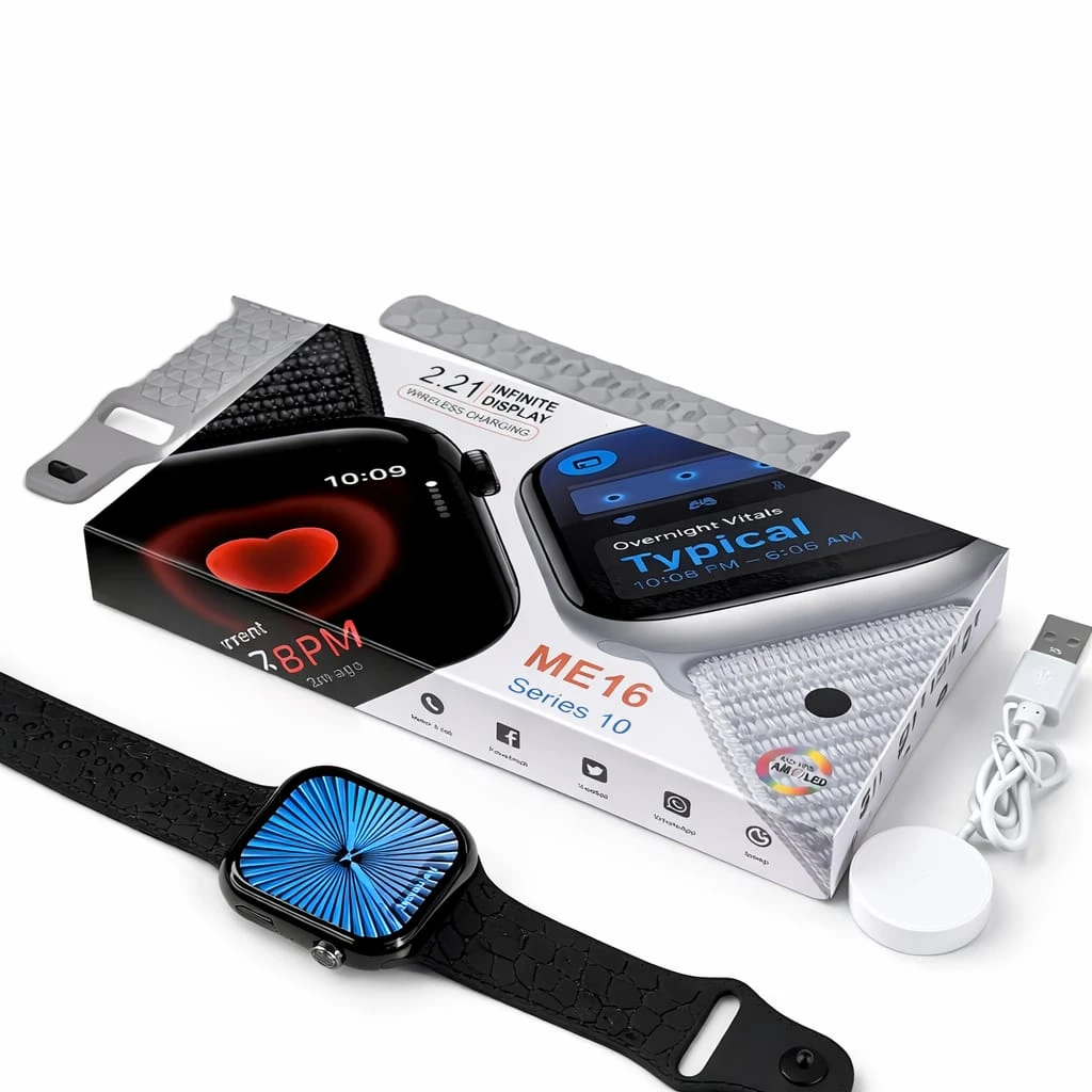 Product DescriptionUpgrade your lifestyle with the ME16 Smart Watch Series 10, a stylish and feature-packed smartwatch designed for modern users and active lifestyles. It features a large 2.21-inch infinity display, delivering a bright, clear, and immersive viewing experience for notifications, fitness tracking, and daily use. The sleek design makes it perfect for both casual and professional wear. With wireless charging support and a long-lasting battery, you can enjoy uninterrupted performance without the hassle of frequent charging. The watch also includes 3 interchangeable straps, allowing you to match your style for different occasions. Built with premium durable materials, the ME16 ensures comfort, reliability, and all-day wearabilityāwhether you're working, exercising, or traveling. Key Featuresā 2.21ā Infinity Display ā Large and vibrant screen Product SpecificationsProduct Type: Smart Watch Package Includes