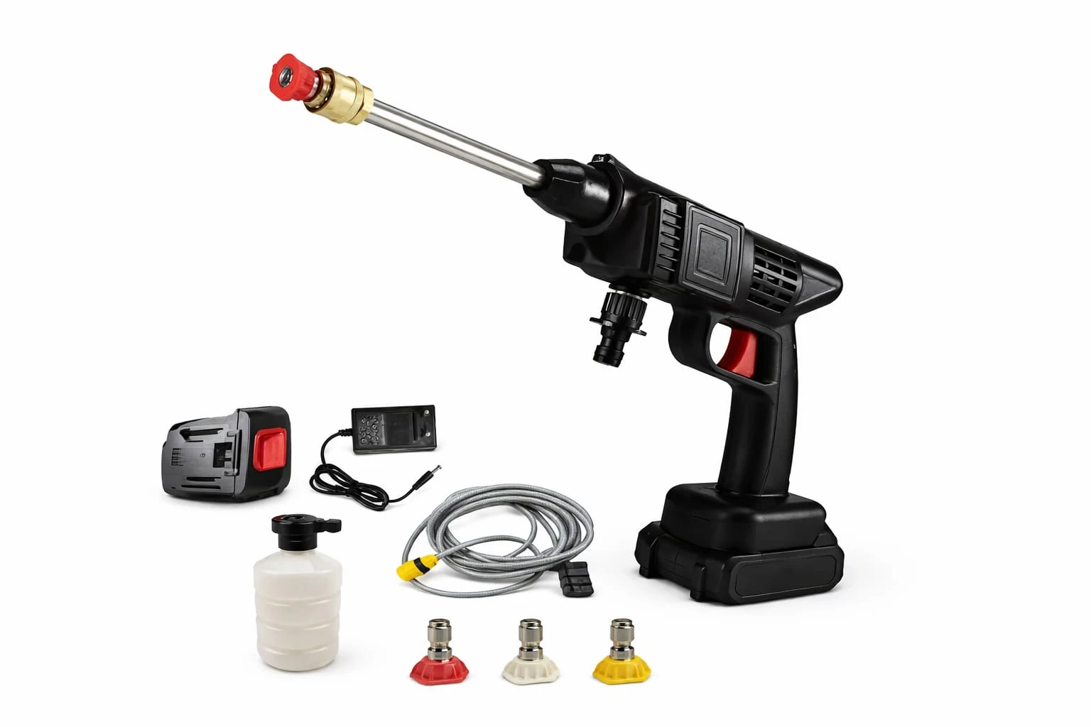 Make cleaning faster and easier with this Cordless High Pressure Washer Gun. Designed for powerful performance, this portable washer delivers strong water pressure to remove dirt, dust, and stains from cars, bikes, floors, and outdoor surfaces. Powered by a rechargeable battery, it offers complete freedom without tangled wires. The adjustable spray nozzles allow you to switch between different water modes—perfect for gentle washing or deep cleaning. It also includes a water hose and detergent bottle for efficient foam cleaning.
