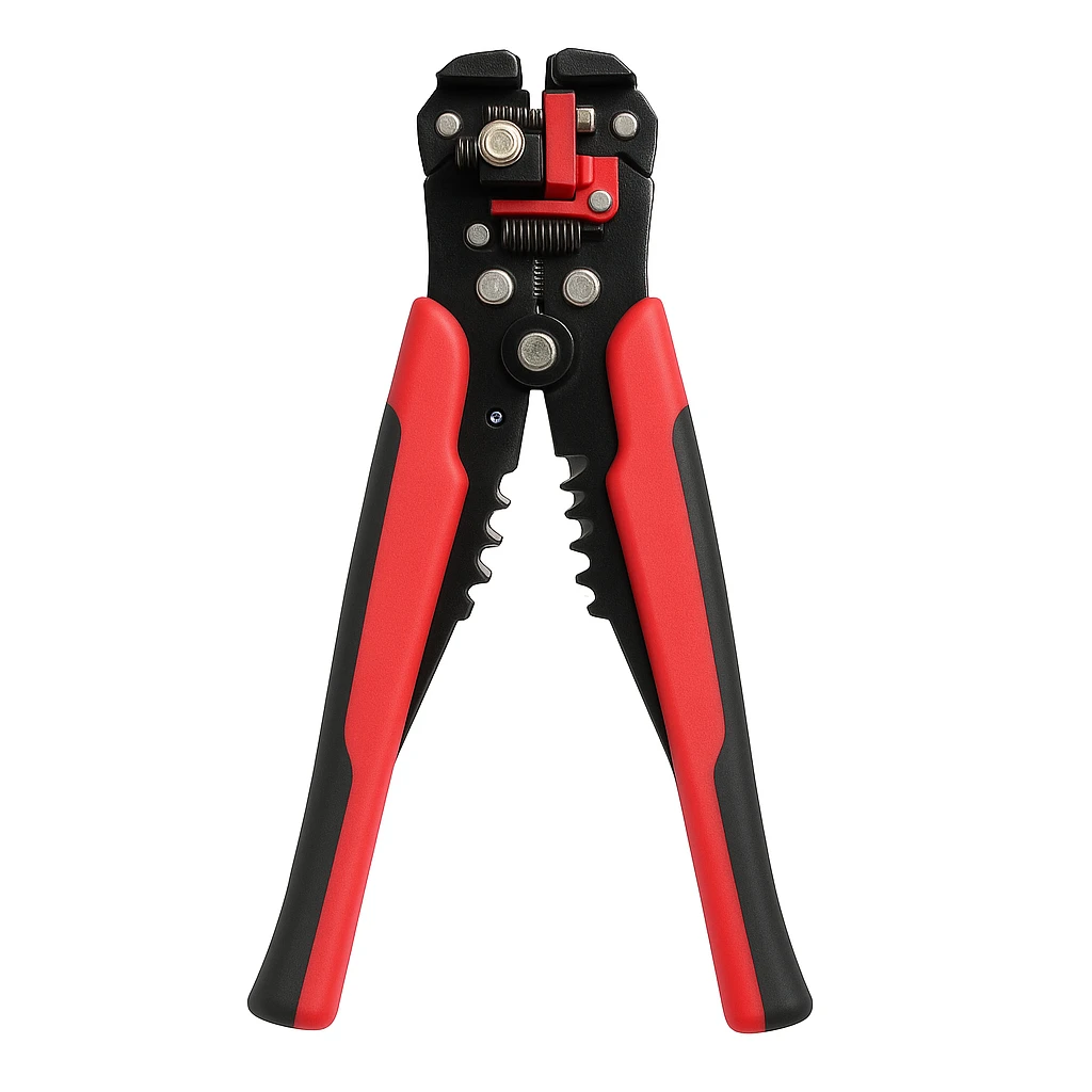 A high-quality automatic wire stripper and crimper tool with red and black ergonomic handles, adjustable stripping jaws, and crimping functions for insulated and non-insulated terminals. Designed for electricians, DIY enthusiasts, and technicians, ensuring fast and efficient wire preparation.