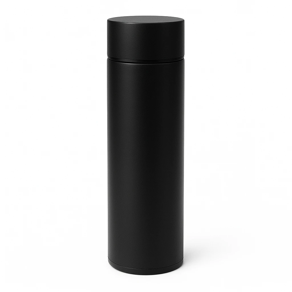 A matte black stainless steel thermos bottle with a sleek cylindrical design and an intelligent LED display on the lid showing the current liquid temperature in Celsius. Ideal for keeping beverages hot or cold for extended hours, perfect for travel, office, or gym use.