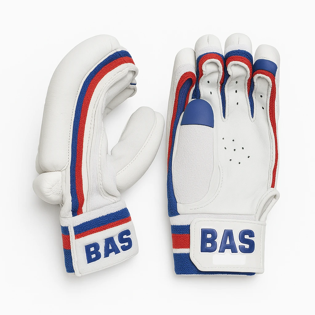 Gear up with BAS Cricket Batting Gloves, designed for comfort, flexibility, and top-tier protection. Featuring a traditional white base with stylish red and blue detailing, these gloves are built for players who value control and durability. The textured palm ensures a secure grip on the bat, while breathable mesh inserts provide ventilation during long innings. Reinforced fingers and padded support deliver excellent impact resistance—ideal for club and competitive cricket.