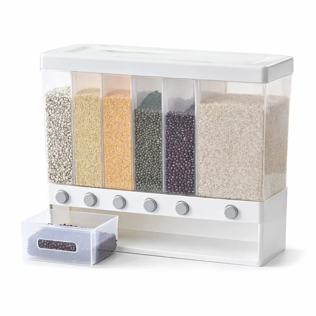 Keep your kitchen clean, organized, and modern with the 6 Compartment Grain Dispenser Container. This smart storage solution allows you to store different types of dry foods such as rice, beans, lentils, cereals, and grains in one compact and convenient container. The dispenser features six separate compartments with easy push-button controls that let you release the exact amount of food you need without opening the entire container. This helps maintain hygiene and prevents spills. Its airtight design protects food from moisture, dust, and pests, ensuring your grains stay fresh for a long time. The transparent body makes it easy to see whatās inside and monitor food levels at a glance. Perfect for modern kitchens that want space-saving and efficient food storage. Key Features