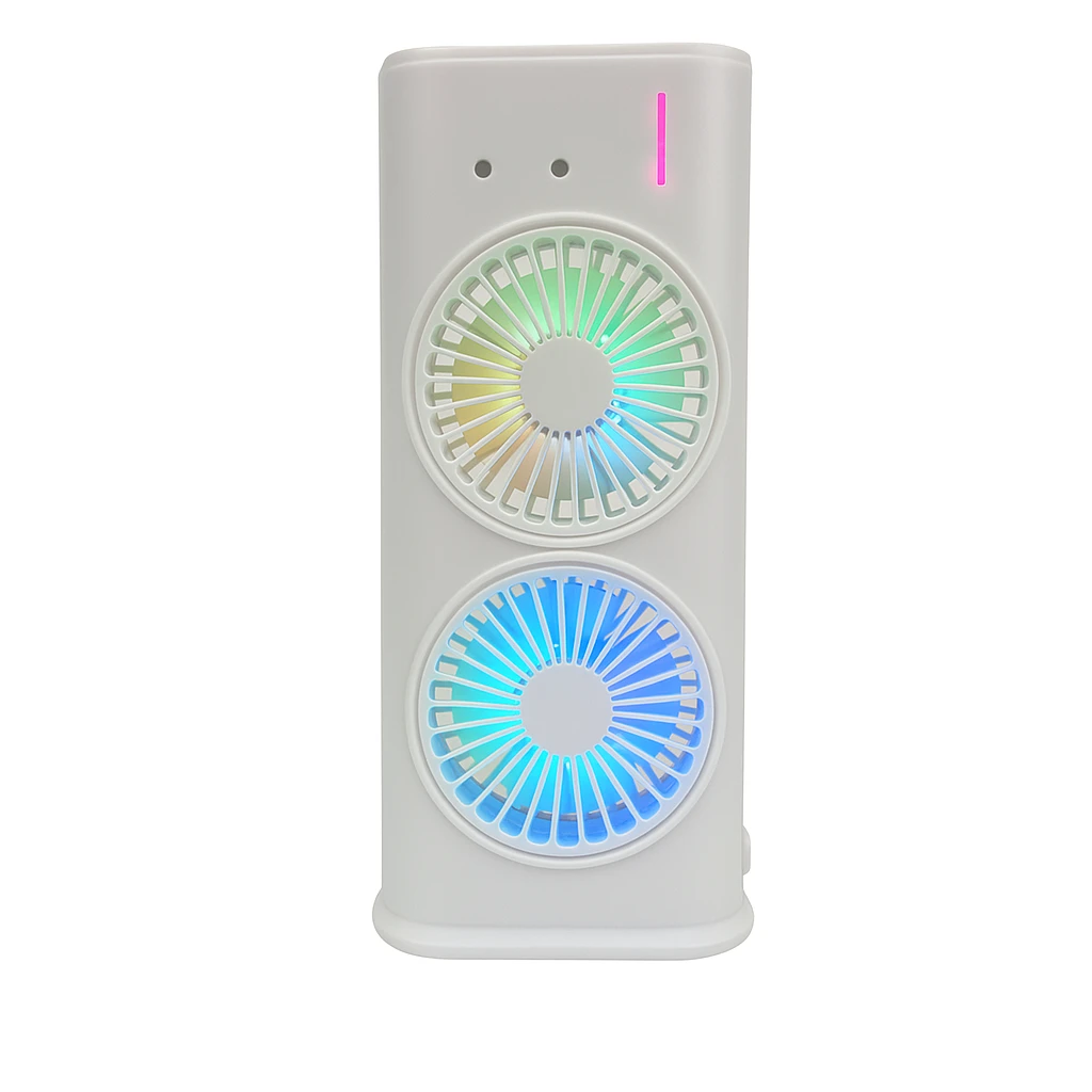 A vertical mini tower fan featuring two circular fan blades with vibrant RGB LED lighting, enclosed in a sleek white body with a pink power indicator, shown on a pure white background.