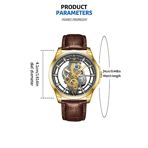 This stunning men’s timepiece features a gold-plated stainless-steel case, a transparent skeleton dial showcasing the intricate inner movement, and a genuine brown leather strap that ensures both comfort and class.