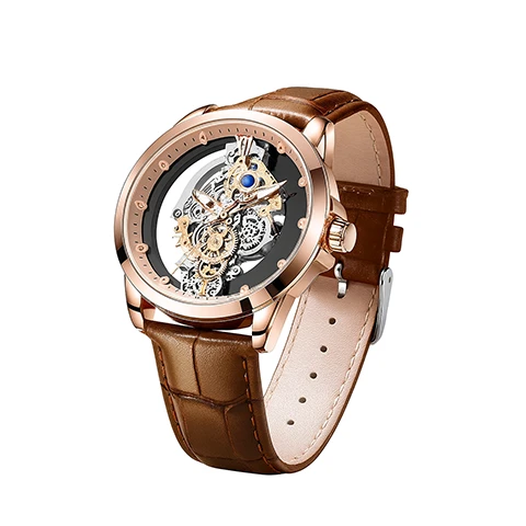 Experience timeless craftsmanship with this Luxury Mechanical Skeleton Watch. Featuring a rose gold case, transparent skeleton dial, and premium brown leather strap, this watch combines elegance with precision engineering. The exposed gear design showcases the beauty of mechanical movement, making it a statement piece for watch lovers and professionals alike. Perfect for business wear, parties, and gifting.
