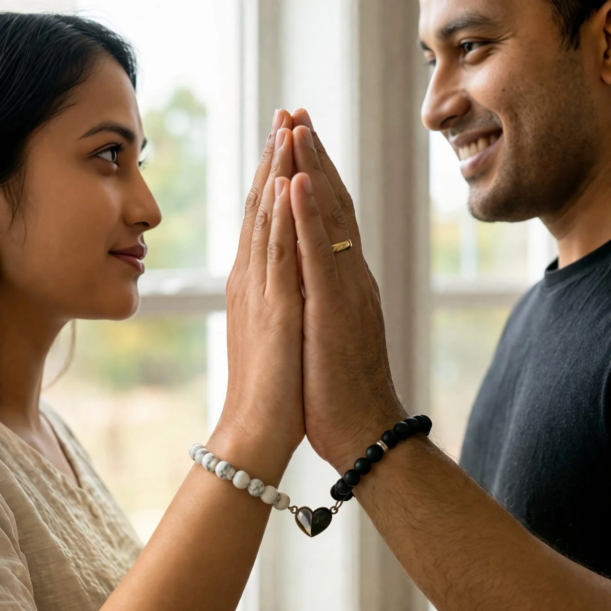Product DescriptionCelebrate your bond with the Magnetic Couple Bracelet – Stay Connected Always, a meaningful and stylish accessory designed for couples. This elegant set features premium black matte beads and white natural stone beads, perfectly paired to symbolize balance and unity. The highlight is the magnetic heart charm, which connects when both bracelets come close—representing love, attraction, and togetherness. Crafted with a high-quality elastic cord, these bracelets are comfortable, durable, and easy to wear all day. Whether it’s for daily use or special occasions, this bracelet set makes a perfect romantic gift for couples. Key Features❤️ Magnetic Heart Charm – Symbol of love & connection Product SpecificationsProduct Type: Couple Bracelet Set Package Includes