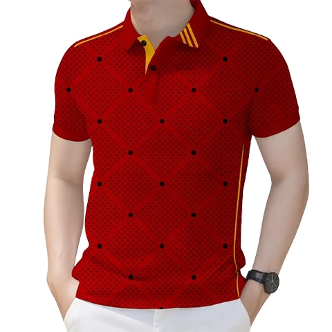 Elevate your wardrobe with this bold Red Polo T-Shirt featuring a modern black dotted grid pattern. The yellow accents on the collar and shoulders add a sporty contrast, making this shirt a perfect mix of casual and sharp style. Designed for comfort, this t-shirt offers a breathable fabric, making it ideal for Bangladesh’s climate.