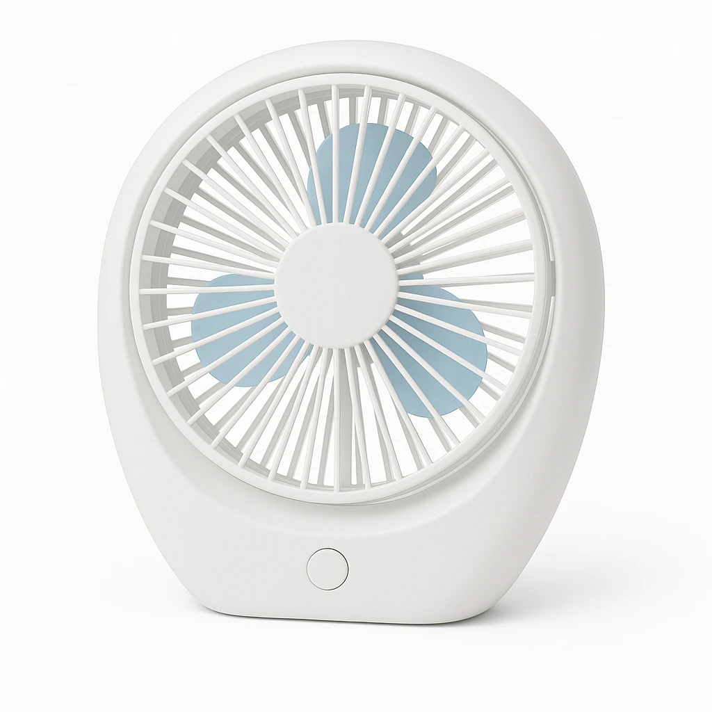 A compact, white desk fan with a modern oval frame and three blue blades enclosed in a radial grille, featuring a single button control, displayed on a pure white background.
