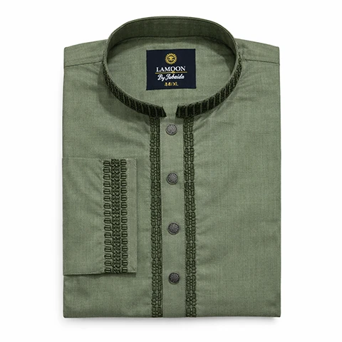 Crafted from high-quality breathable fabric, this kurta features detailed dark-tone embroidery along the placket and sleeve panel, creating a refined and balanced design. The elegant mandarin collar and matching metallic buttons enhance its premium finish, making it ideal for Eid, weddings, Friday prayers, and cultural gatherings.