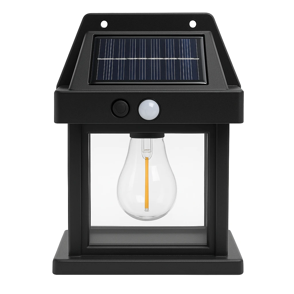 A modern black solar-powered LED wall lantern featuring a transparent casing with a vintage-style bulb, built-in motion sensor, and top-mounted solar panel. Designed for garden, porch, or entryway lighting, this energy-efficient lamp automatically illuminates at night and charges during the day.